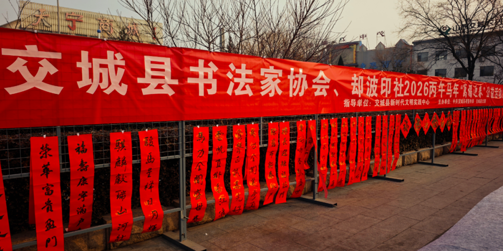 文明山西网讯 1月27日上午,由交城县新时代文明实践中心指导,中共交城县委宣传部、交城县人民武装部、交城县文联主办,交城县书法家协会、交城却波印社承办的2026丙午马年“万福迎春”公益活动启动仪式在县城广场隆重举行。