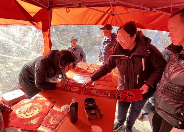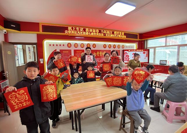 孩子们围聚在拓福拓印区,小手捏着拓印工具轻按慢拓,墨香萦绕间,一张张红彤彤的福字跃然纸上,稚嫩的脸庞满是成就感,把马年的美好期许亲手“拓”进新春;大人们则齐聚剪纸区,指尖翻飞、剪刀轻舞,红纸在巧手下化作吉祥窗花、灵动瑞马,让“纸上生花”的主题寓意落地生根,非遗文化的魅力在亲身体验中代代传递;写对联区里,书法爱好者挥毫泼墨,红纸上的吉祥祝福跃然眼前,居民们手捧春联,笑意盈盈。