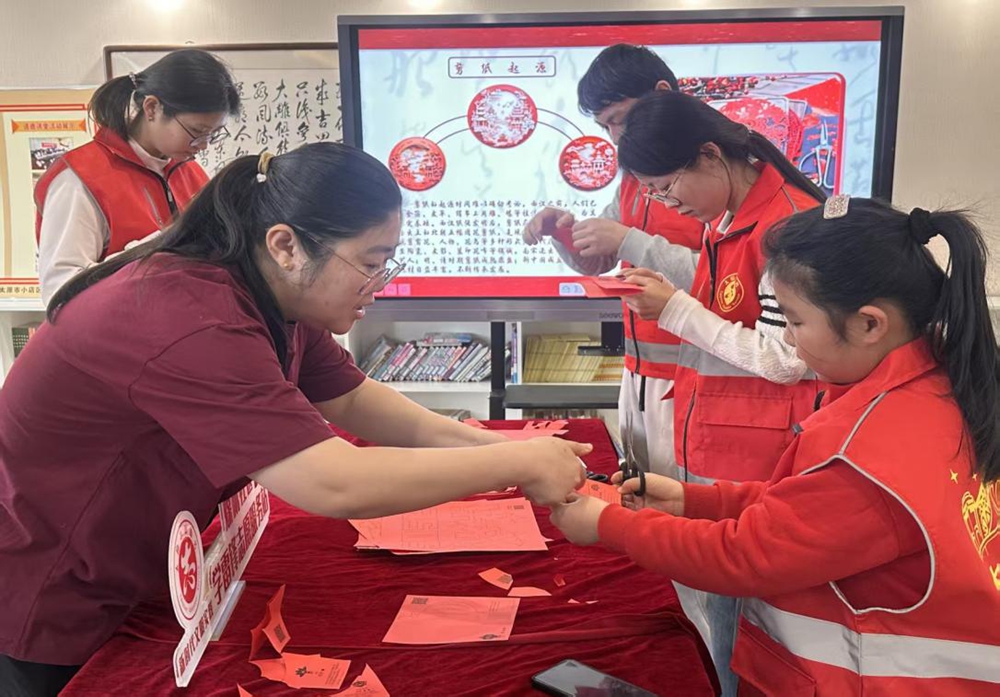另一边的剪纸区域同样热火朝天。志愿者们耐心地教大家折叠红纸、勾勒纹样,剪刀在指尖上下翻飞,不一会儿,一张张红纸就变成了栩栩如生的生肖福字、吉祥窗花。居民们互相展示着自己的作品,欢声笑语充满了整个实践站。