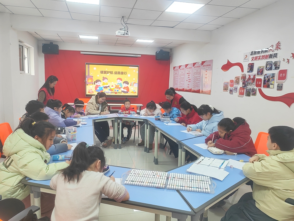 在动手创作环节,孩子们热情高涨、跃跃欲试。大家拿起画笔、调色盘,在画纸上认真勾勒、细心填色,将心中对新年的美好祝愿融入创作。有的描绘憨态可掬的生肖形象,有的绘制喜庆热闹的福字春联,有的创作寓意吉祥的花鸟图案,稚嫩的笔触间满是童真与创意。志愿者与托管班老师穿梭在孩子们中间,耐心指导绘画技巧,鼓励大家大胆发挥想象,现场气氛温馨热烈、年味十足。