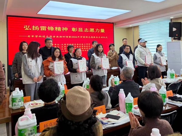 文明山西网讯 3月5日是第63个学雷锋纪念日,太原市老军营街道举行“弘扬雷锋精神 彰显志愿力量”志愿者激励回馈暨 2026年学雷锋志愿服务启动仪式,表彰优秀典型、授旗组建队伍,分享奉献故事,凝聚志愿力量。