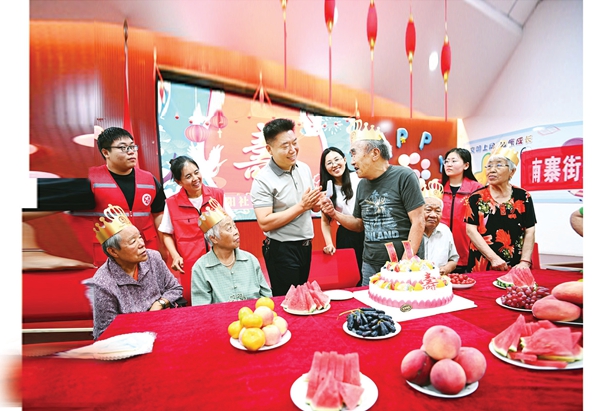 南寨街道“共享儿女”陪伴社区的独居老人过集体生日。