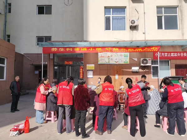 活动现场秩序井然、氛围热烈。养固健团队代理人田祥娥及工作人员现场展演八段锦,教授健脑手指操、拍八穴操,普及春季养生知识,开展健康指导,并为老年居民提供头部、肩颈按摩服务,传授简单易学的居家通经活络方法。