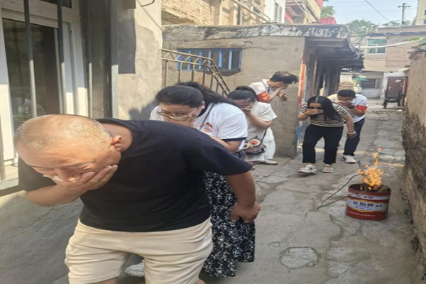随着警报声响起,现场顿时弥漫起烟雾。工作人员迅速组织居民用湿毛巾捂住口鼻,按照预定的疏散路线,有序地向安全区域撤离。在撤离过程中,大家保持冷静,听从指挥,避免了拥挤和踩踏事故的发生。与此同时,华阳房产六部与社区人员紧密配合,迅速展开灭火行动,利用灭火器对“着火点”进行扑救。经过紧张有序的扑救,“火势”被成功扑灭,演练取得圆满成功。