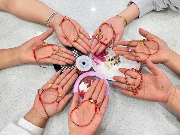 一大早,志愿者就上山,为居民们寻找最新鲜的艾草,作为主要材料。想要做出精美的花环,装饰品必不可少。志愿者王大爷展示了艾草、黄金球、浆红果等插花材料,详细讲解了捆扎的技巧,现场进行示范。在工作人员的带领下,大家固定花形、缠上艾草、扎上装饰鲜花、系上垂饰,丝带……通过“剪”“扎”“插”“系”等操作,不一会儿,一个个精美的艾草花环呈现在了大家的眼前,整个活动室里都弥漫着艾草的清香。大家满怀着成就感,欣赏着自己的亲手制作的花束并合影留念,大家分享着亲自动手制作花环的“初体验”带来的快乐,做完花环,又在志愿者的带领下一起编手绳,祈求安康。翠绿的艾草与五彩斑斓的手绳相映成趣,既饱含着驱邪纳福的美好寓意,又凝聚着邻里间的浓浓温情。