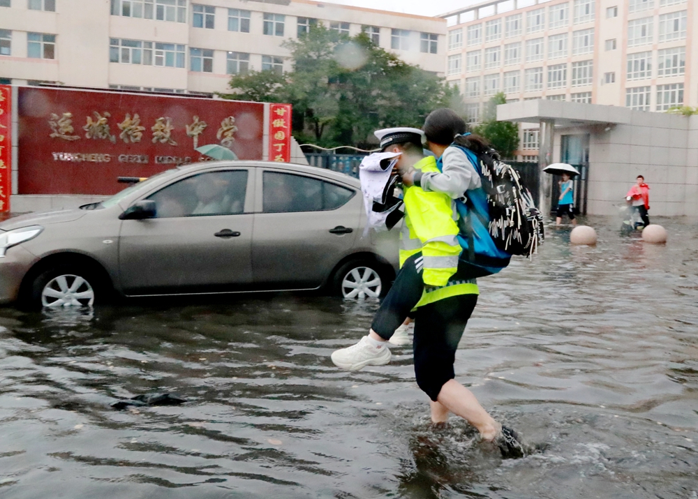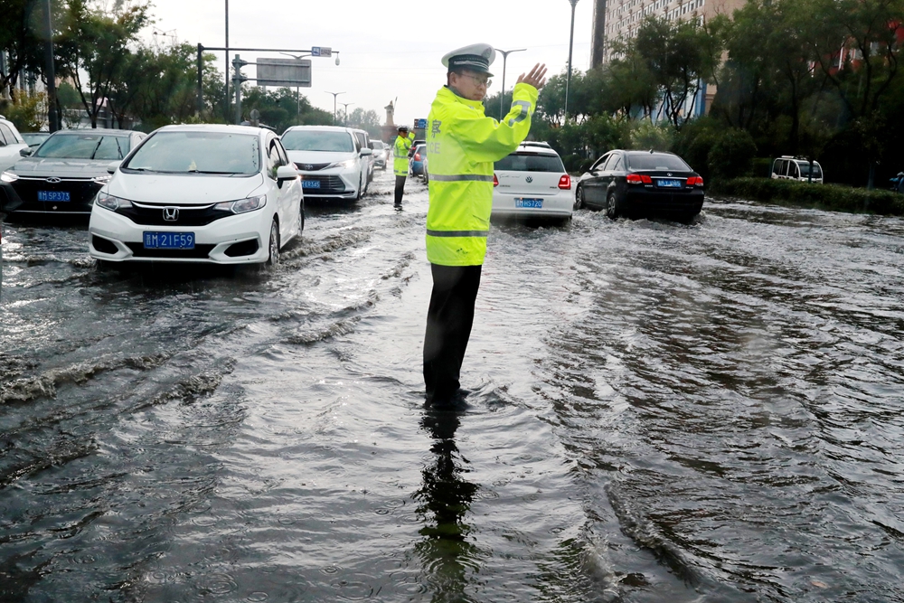 文明山西网讯 6月18日,运城市盐湖区迎来今年以来范围最广的暴雨,运城市公安局盐湖分局交警大队一线中队民警提前进入应急状态,全员投入抗击暴风雨并迅速奔赴防汛一线巡逻防控、排查隐患、疏导保畅救助群众……化身风雨中的“守路人”。(葛崇收)