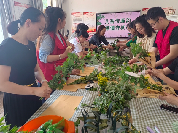 艾艺传廉:指尖绽放清风雅韵 在“特别的‘艾’给特别的你”艾草门挂制作活动中,志愿者融合传统文化与廉洁理念,讲解艾叶、菖蒲民俗寓意并延伸至廉洁精神内核。在志愿者的引导下,大家精心挑选带有国风特色、印着《爱莲说》的包装纸,将艾草与菖蒲悉心包裹其中。