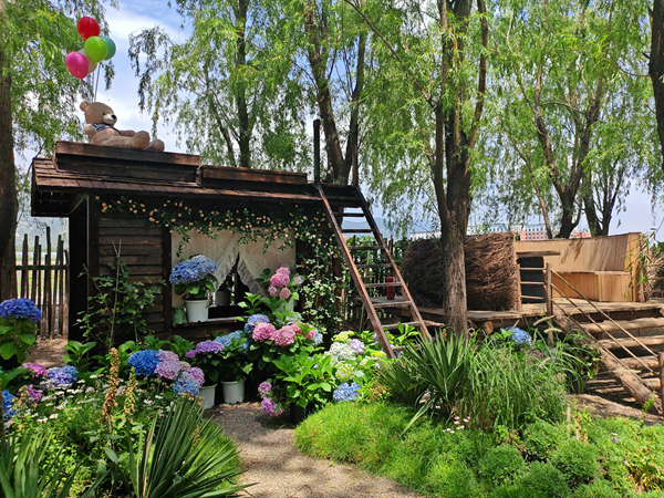 许多游客一进园,就被眼前的美景所震撼:“满眼都是绣球花,感觉自己走进了童话世界!”沿着蜿蜒的步道前行,穿梭在“云端绣球花海”之中,一路花浪相伴,浓烈与温柔交织,鲜活的色彩在风中流淌,宛如一首灵动的诗行。游客们或俯身轻嗅花香,沉醉于这馥郁芬芳;或倚靠花丛,拍摄一组美美的写真,记录下此刻的美好。若是逛累了,还能在“花屿见·主题花季木屋”稍作休憩。在这里,林间绣球花与自然音疗相互交融,奏响治愈的乐章。闭上双眼,聆听绣球花的沙沙低语,让疲惫的心灵得到彻底的放松。
