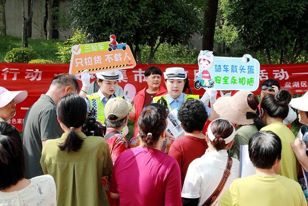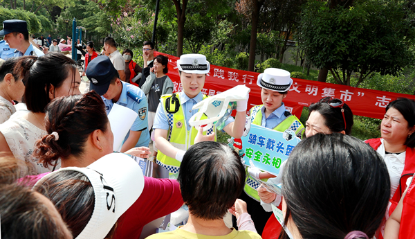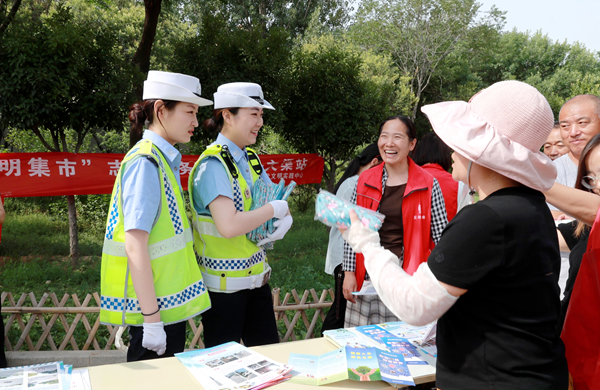 文明山西网讯 为切实提高夏季群众的交通安全意识预防道路交通事故发生,6月24日,运城市公安局盐湖分局交警大队组织宣传民警走进辖区圣惠小公园,参加盐湖区“文明实践我行动·文明集市”志愿服务活动——大渠站宣传,向休闲娱乐及过往群众发放宣传挂图、宣传页以及印有交通安全知识的手提袋、围裙开展以案释法警示教育。同时,民警结合大家的日常出行方式,宣讲交通安全知识,引导其遵守交通安全法律法规,自觉做到骑乘摩托车、电动车佩戴好安全头盔、三轮车拒绝载人、不酒驾不醉驾,安全文明出行。图为当日宣传场景。